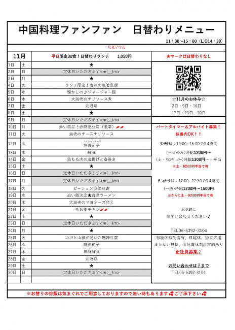 さて11月のファンファンですが、日替わりランチに新メニューが登場♪