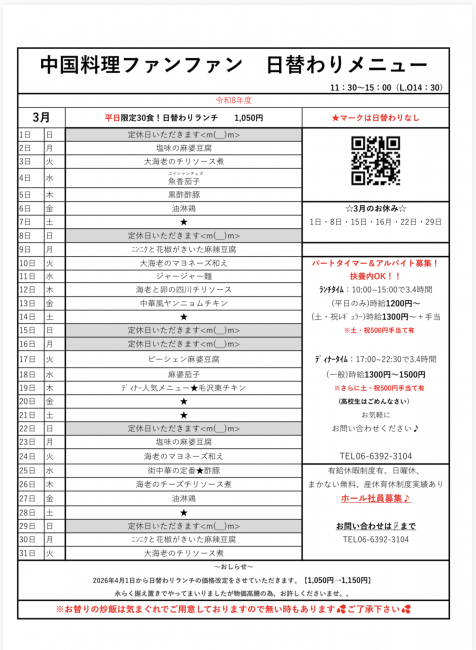 3月も中国料理ファンファンをよろしくお願いいたします!!!